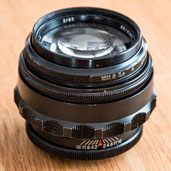 Oben: Das Voigtländer Color-Ultron 1.8/50 mm an der Voigtländer VSL1 TM. Die Kamera bietet Blendeneinspiegelung und Offenblendmessung, aber nur mit diesen Objektiven, die für sie gebaut wurden. Fujica-Objektive lassen sich wegen dem Blendennocken nicht bis zur Nullstellung einschrauben.